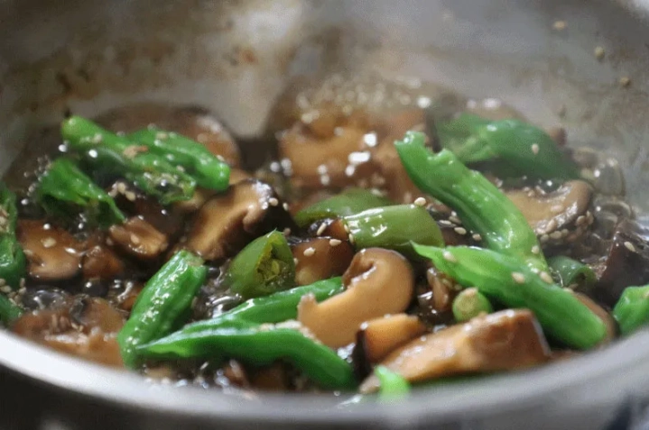 [재료]: 표고버섯 5개, 꽈리고추 5개, 통깨, 참기름
