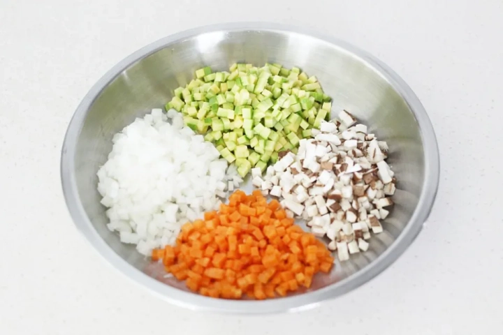 [재료]: 소고기 100g, 밥, 표고버섯 1개, 당근 1/4개, 애호박 1/4개, 양파 1/4개