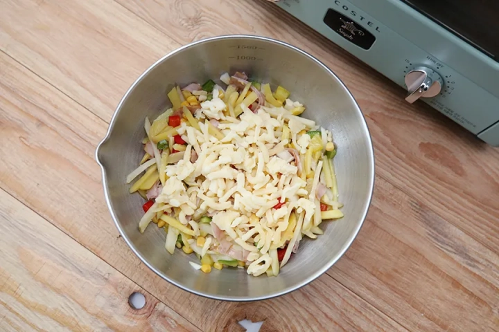 준비한 피자치즈를 반쯤 더해 골고루 섞어주세요.