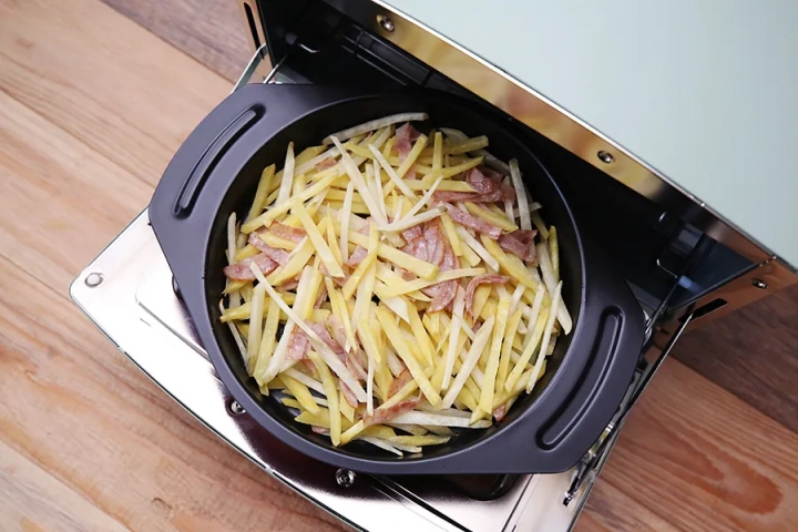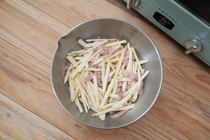 채썬 고구마에 베이컨을 더하고