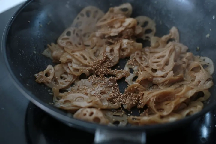 마늘향이 올라오면 연근을 볶아주세요.