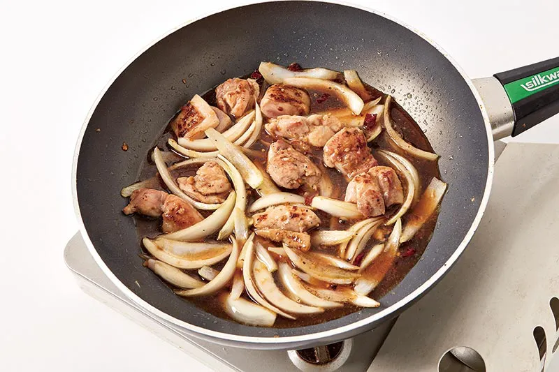 향이 올라오면 닭다리살을 넣고 볶아주세요.