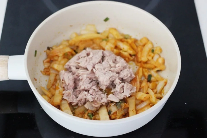 참치를 더해 너무 뭉개지지 않게 볶아주세요.
