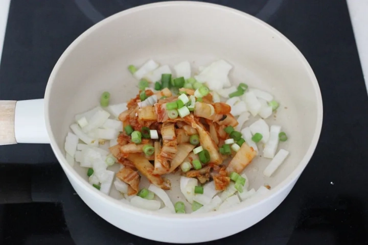 양파가 투명해지면 파와 김치를 넣고 5분 정도 볶아주세요.