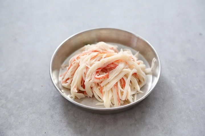 [재료]: 달걀 3개, 크래미 2개, 대파 1/2대, 전분물
