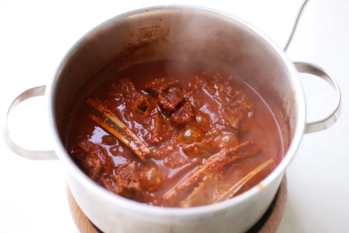 고춧가루가 갈비에 착 달라붙을때까지 충분히 졸여주세요.