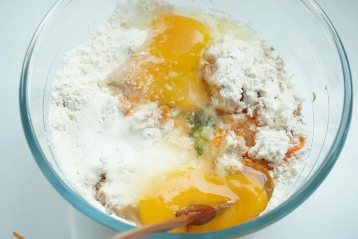 부침가루를 4큰술 더해 반죽을 만들어주세요.