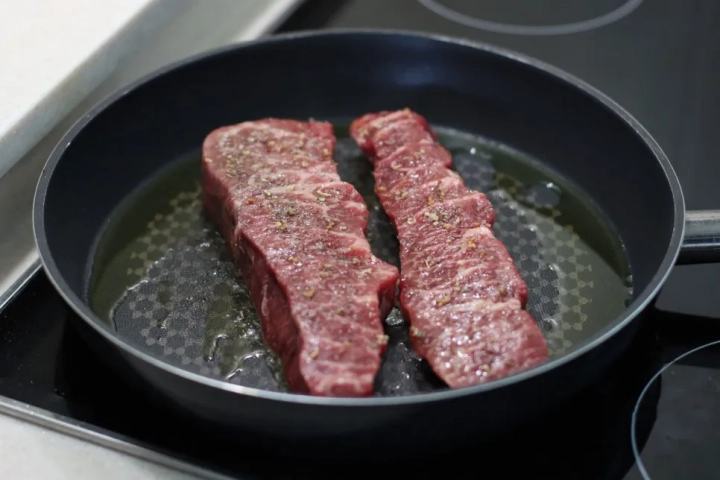 팬을 뜨겁게 달궈 버터를 녹인 후 고기를 올려주세요.