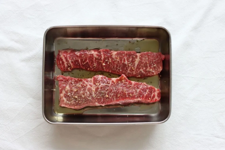 스테이크용 소고기에 소금과 통후추를 갈아서