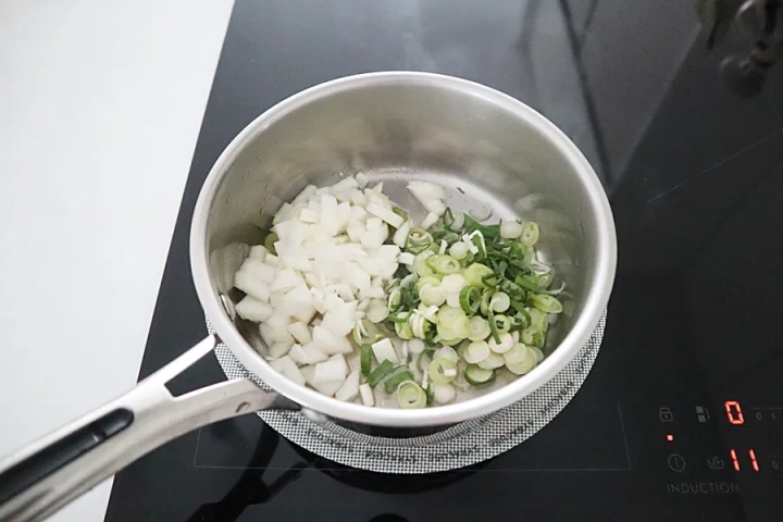 달군 팬에 참치기름을 둘러 양파, 대파를 넣어 볶아주세요.