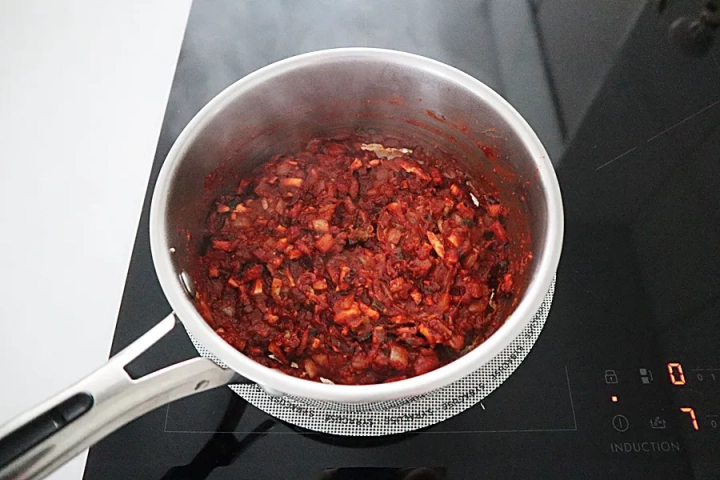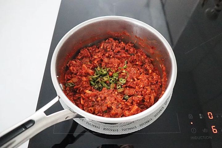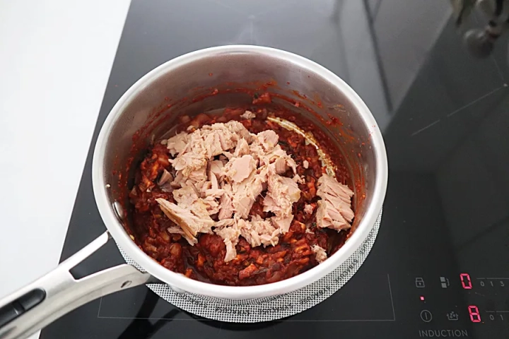 양념이 골고루 섞어지면 참치를 넣고 볶아주세요.