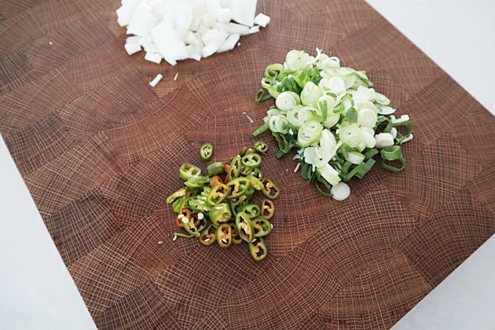 [재료]: 참치캔 1개, 양파 1/4개, 대파 1/2대, 청양고추