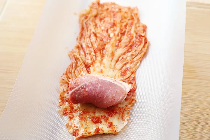 김치를 넓게 펴고 삼겹살을 돌돌 말아주세요.