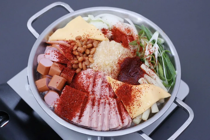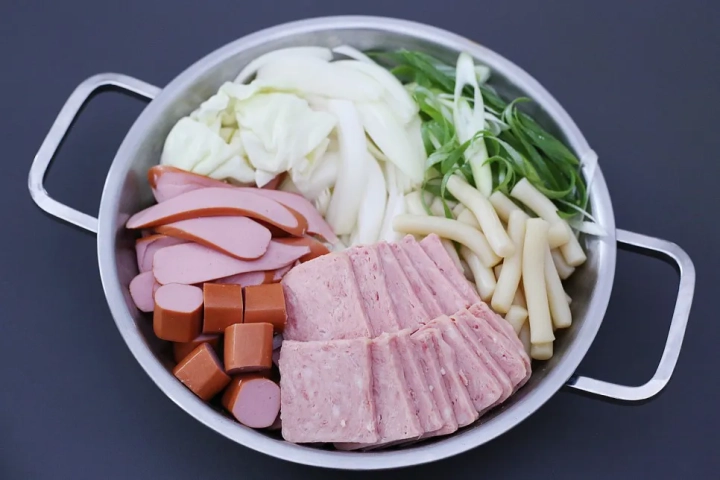 그 위에 햄, 소시지, 야채, 떡볶이떡을 담아주세요.