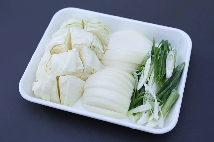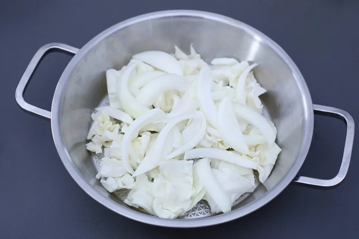 냄비 바닥에 양배추, 양파를 깔아주세요.