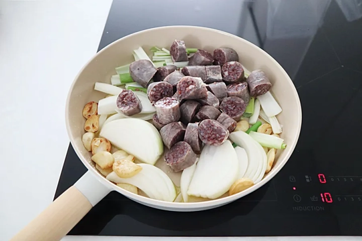 마늘 향이 올라오면 대파, 양파, 순대를 넣고