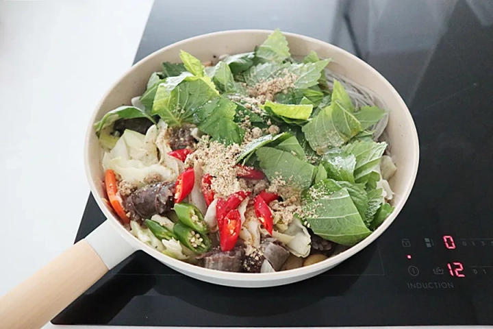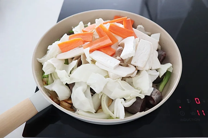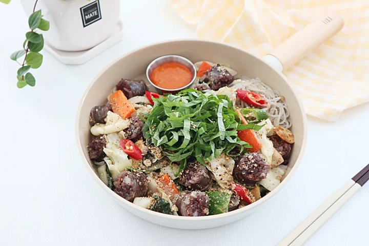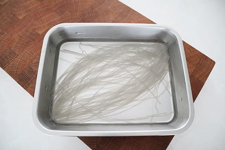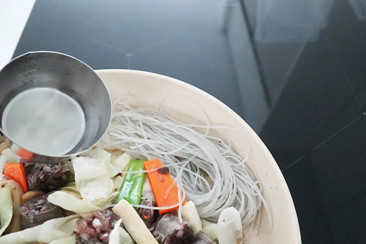 당면을 팬 한쪽에 넣고 물 1/4컵을 부어 다시 골고루 섞어주세요.