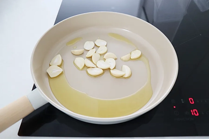 팬에 식용유를 두르고 마늘을 노릇노릇하게 볶아주세요.