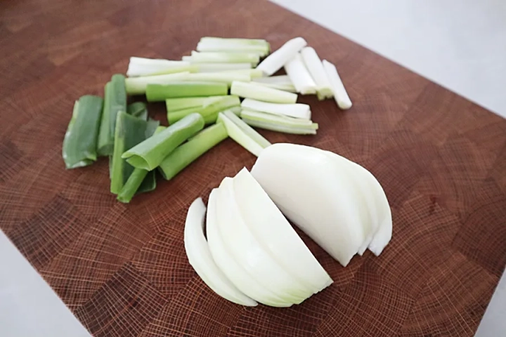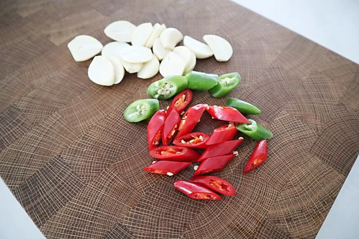 고추는 어슷하게 썰고 마늘은 편으로 썰어주세요.