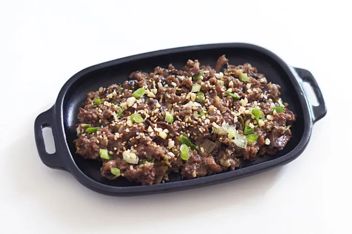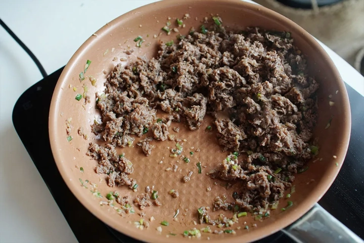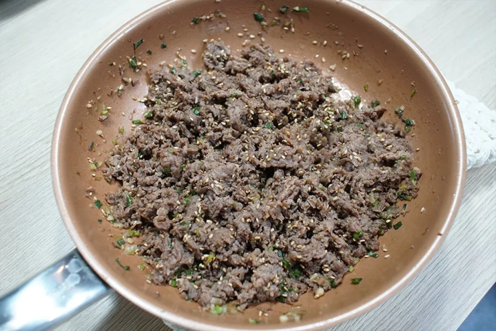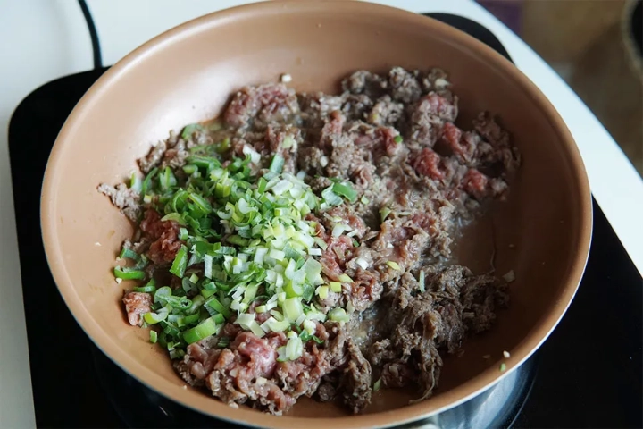 달군 팬에 양념한 고기와 다진 대파를 넣어 바싹 익혀주세요.