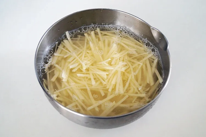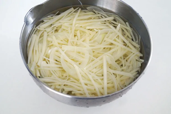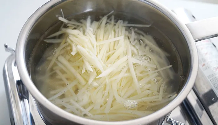 팔팔 끓는 물에 소금을 더해 감자채를 넣어 40초 정도 데쳐주세요.