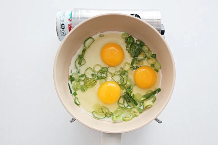 대파 위에 계란3개를 노른자 터지지 않게 깨트려주세요.