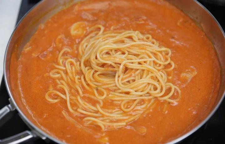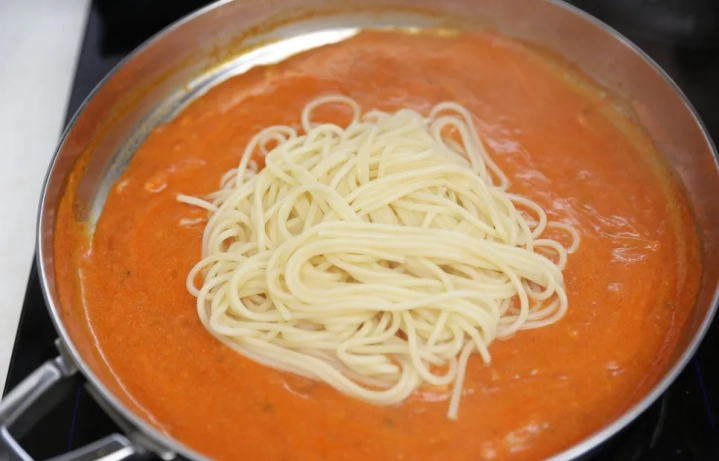 물이 끓으면 파스타면을 활짝 펼쳐서 넣어주세요.
