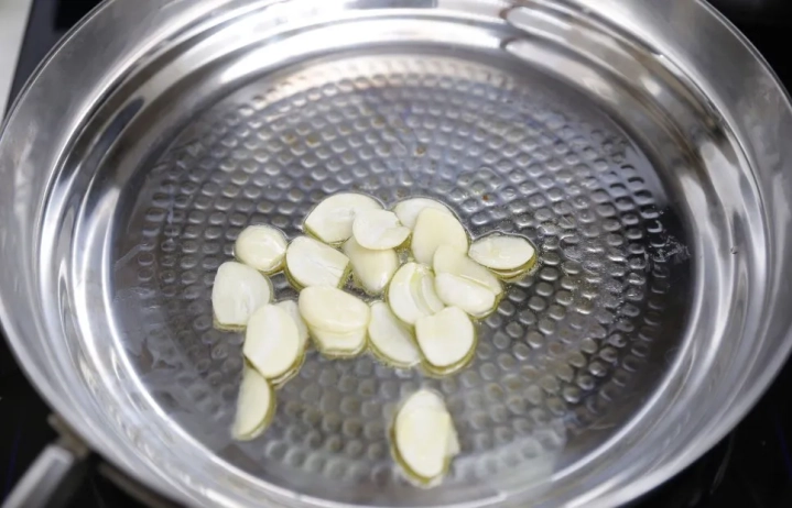 팬에 올리브오일을 두르고 편마늘을 볶아주세요.