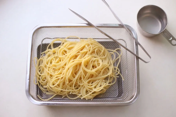 삶은 면을 절대 찬물에 헹구지 말고 그대로 물기 제거해주세요.
