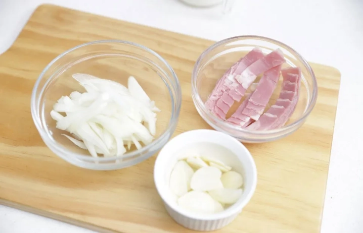 [재료]: 스파게티면, 통마늘 4개, 베이컨 2장, 양파 1/4개