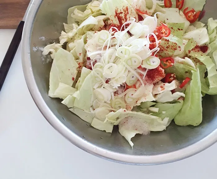 [재료]: 양배추 1통, 굵은소금 1컵, 매실청 100ml,
