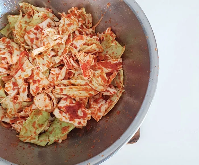[양념재료]: 고춧가루 1컵반, 다진마늘 2큰술, 다진생강 1/2큰술, 소금