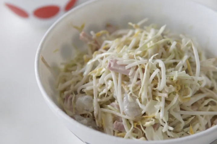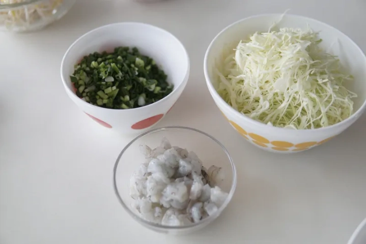 [재료]: 양배추 1/4개, 숙주, 새우 200g, 베이컨200g,