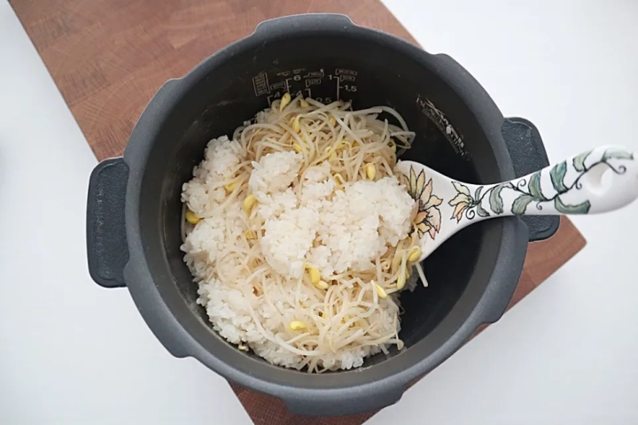 콩나물 삶은 물을 일반 밥 하듯 동일하게 부어 취사해주세요.