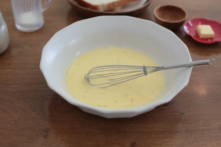 [재료]: 식빵 2장, 달걀 2개, 우유, 버터, 소금 약간, 연유