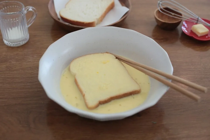 달걀물에 식빵을 앞뒤로 푸~욱 담궈주세요.