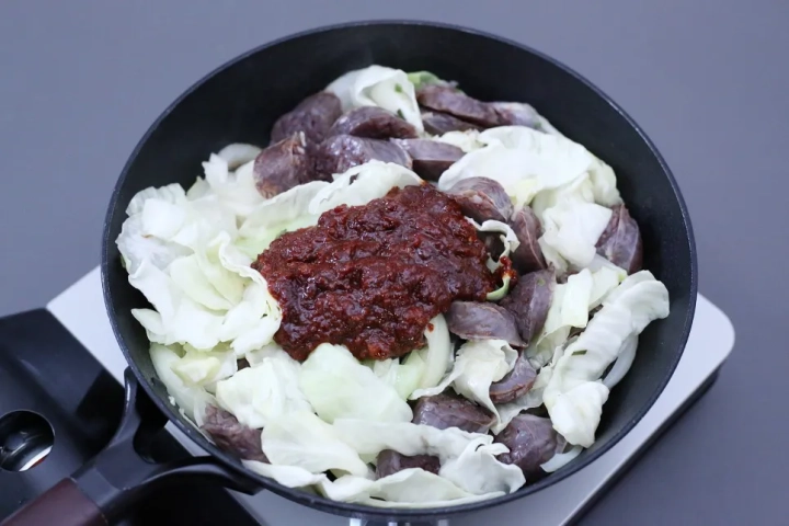 [재료]: 순대 300g, 양배추 180g, 양파 1/2개, 대파 1/2대, 깻잎 10장