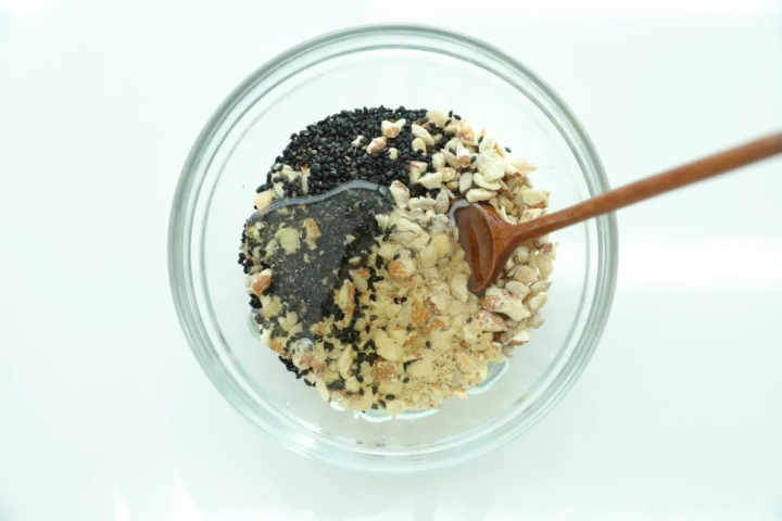 잘게 다진 견과류에 검은깨와 꿀을 더해 골고루 섞어주세요.