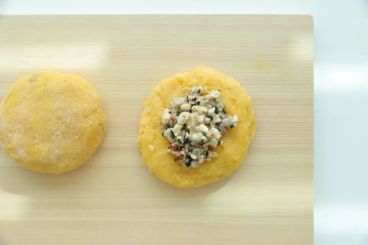 [재료]: 고구마 500g, 견과류, 핫케이크가루, 모짜렐라치즈, 꿀