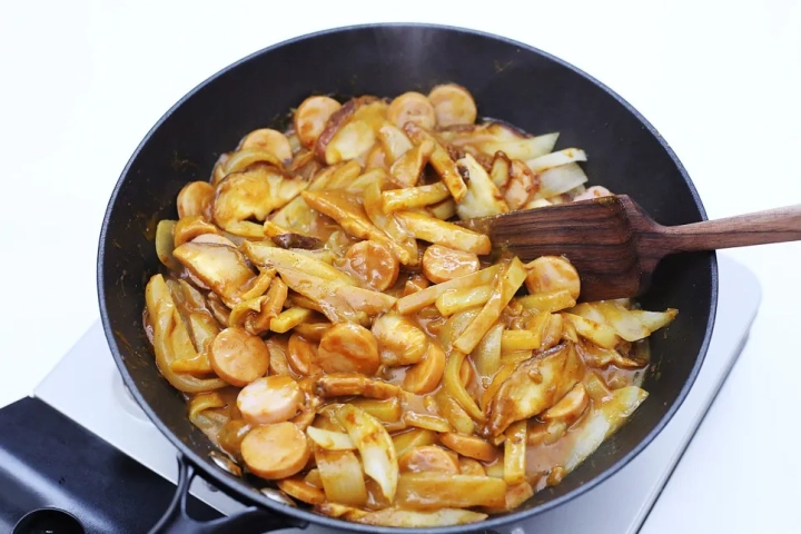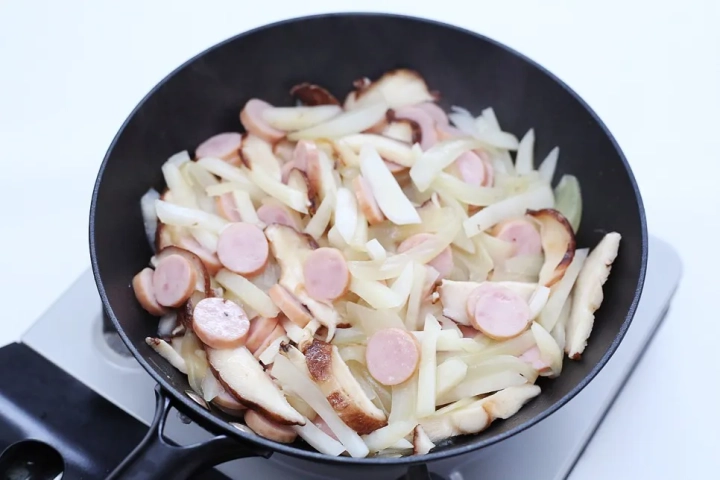 양파가 완전히 익으면 감자, 버섯, 소시지를 더해