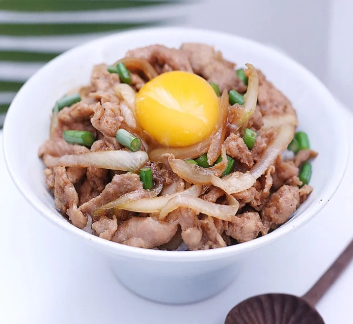 그릇에 밥을 담고 위에 돼지고기볶음을 올려주고