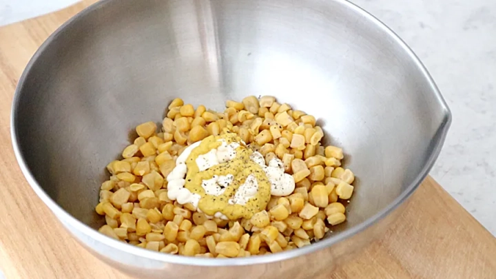옥수수는 뜨거운 물로 헹궈주고 체에 받쳐 물기를 제거해주세요.