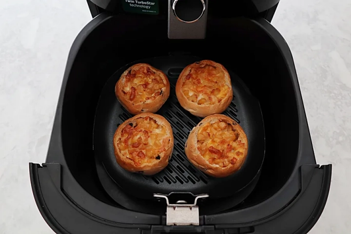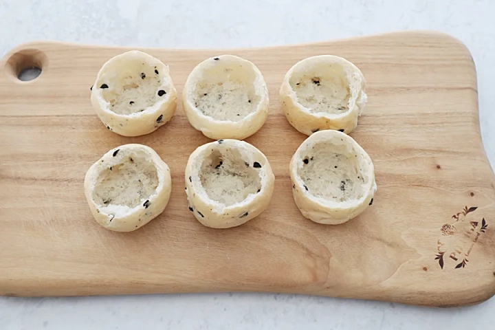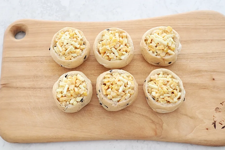 속 비워진 모닝빵에 콘치즈를 듬뿍 채워주세요.