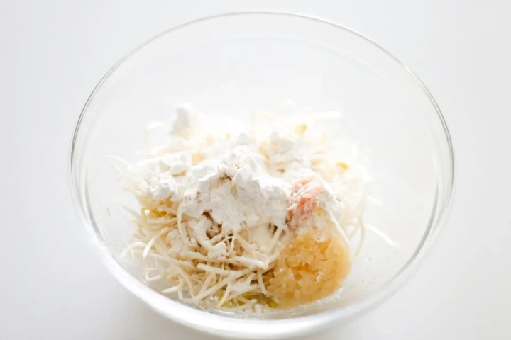 [반죽재료]: 다진마늘 1큰술, 새우젓 1/2큰술, 부침가루 3큰술, 달걀 1개