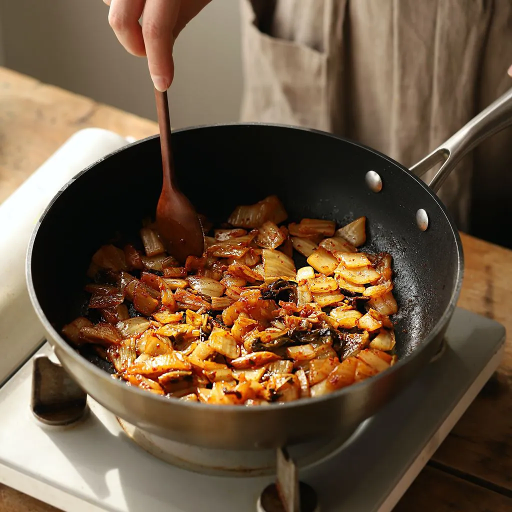팬에 잘게 썬 김치와 양념을 넣어 볶아주세요.