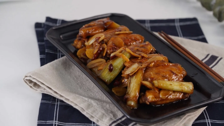 잘 구워진 닭날개에 대파, 통마늘을 더해주고