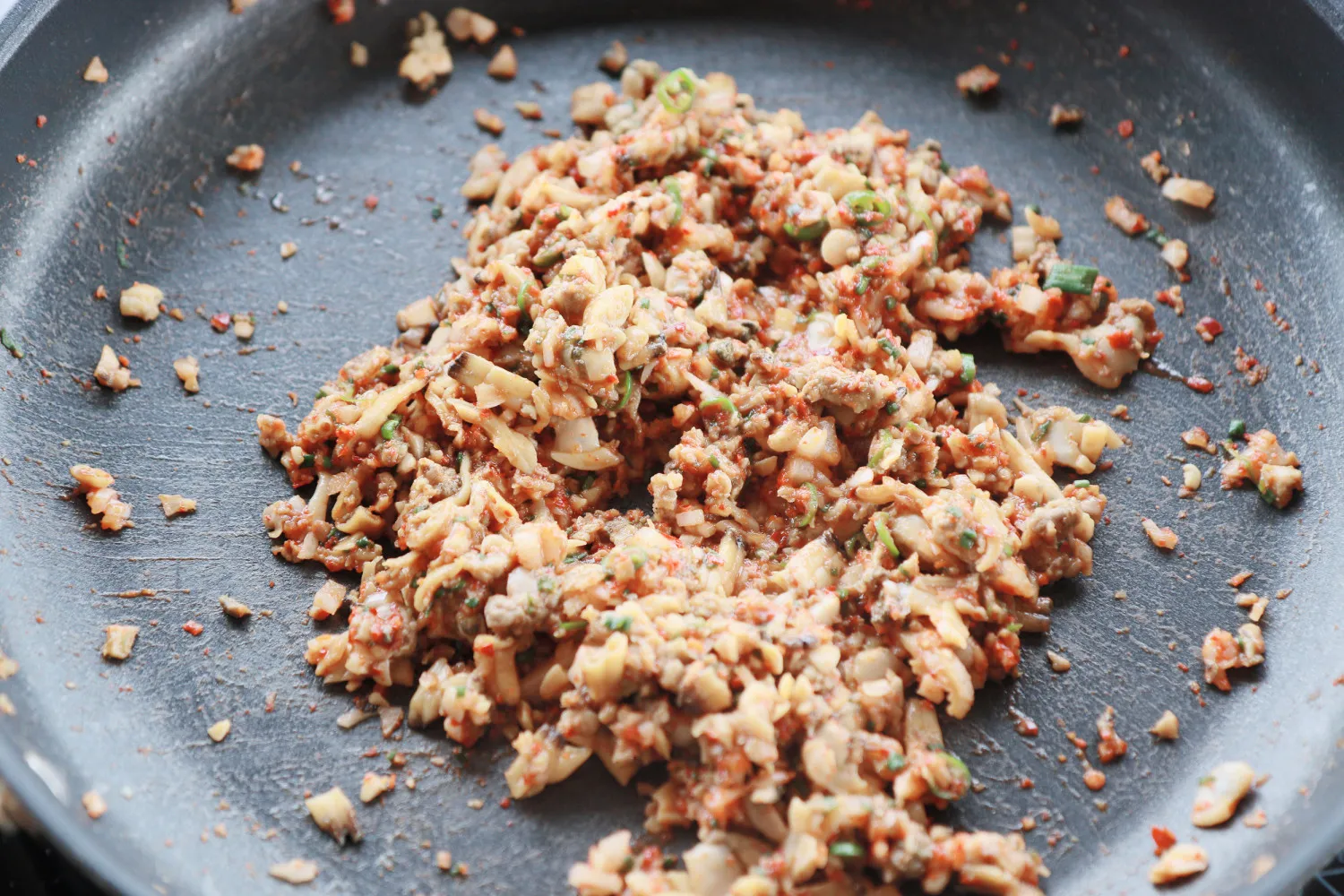 물이 나오면 중불로 줄여 수분을 날려주세요.