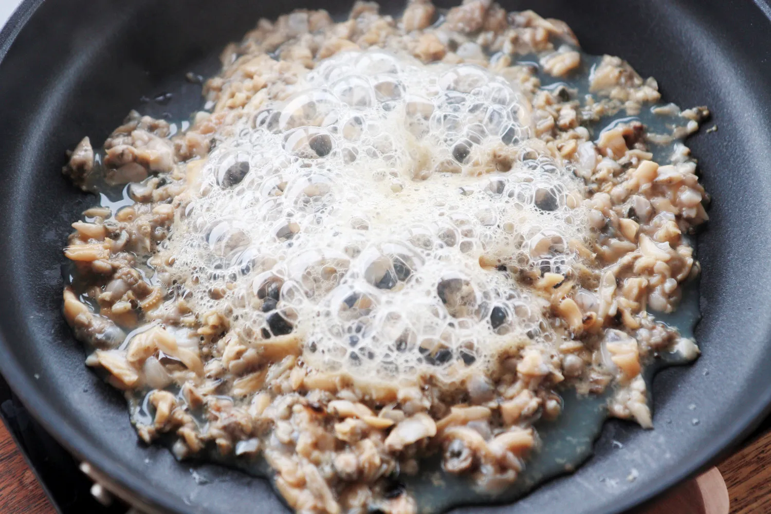 프라이팬에 기름 없이 센불로 조갯살을 볶아주세요.