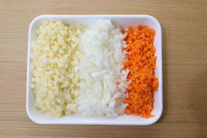 양파 1개, 당근 1/3개, 감자 1개, 다진마늘 1큰술, 소금 약간, 후추 약간