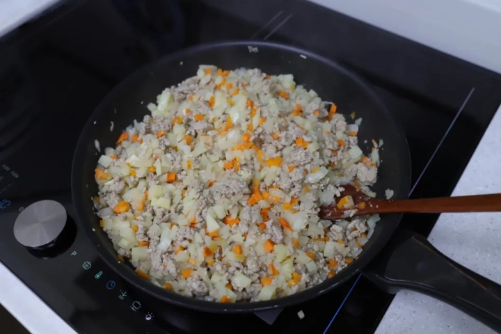 다진돼지고기를 넣고 잘 흩어지게 볶아주세요.